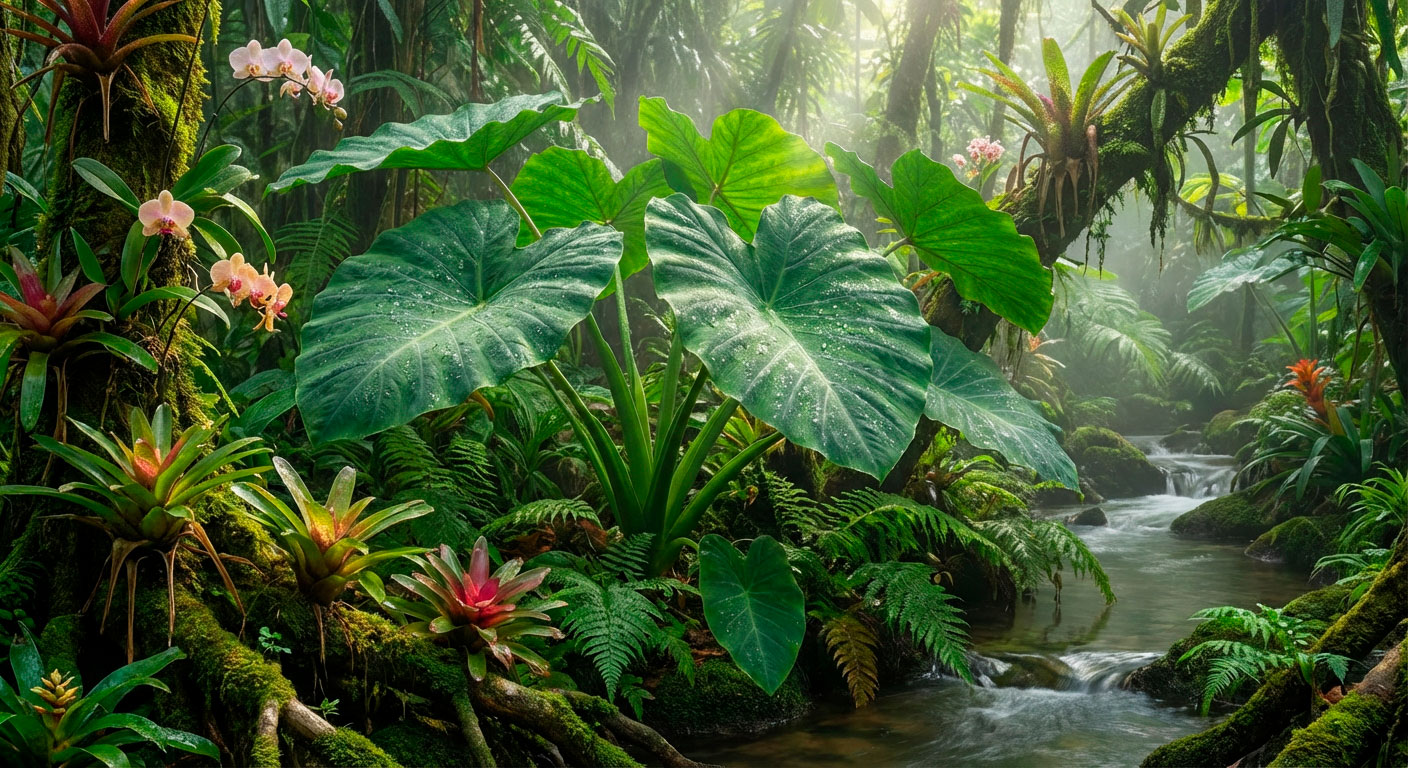 Тропическая колоказия (Colocasia) для роскошного оформления береговой линии, зимостойкие нимфеи (кувшинки), оксигенаторы. |