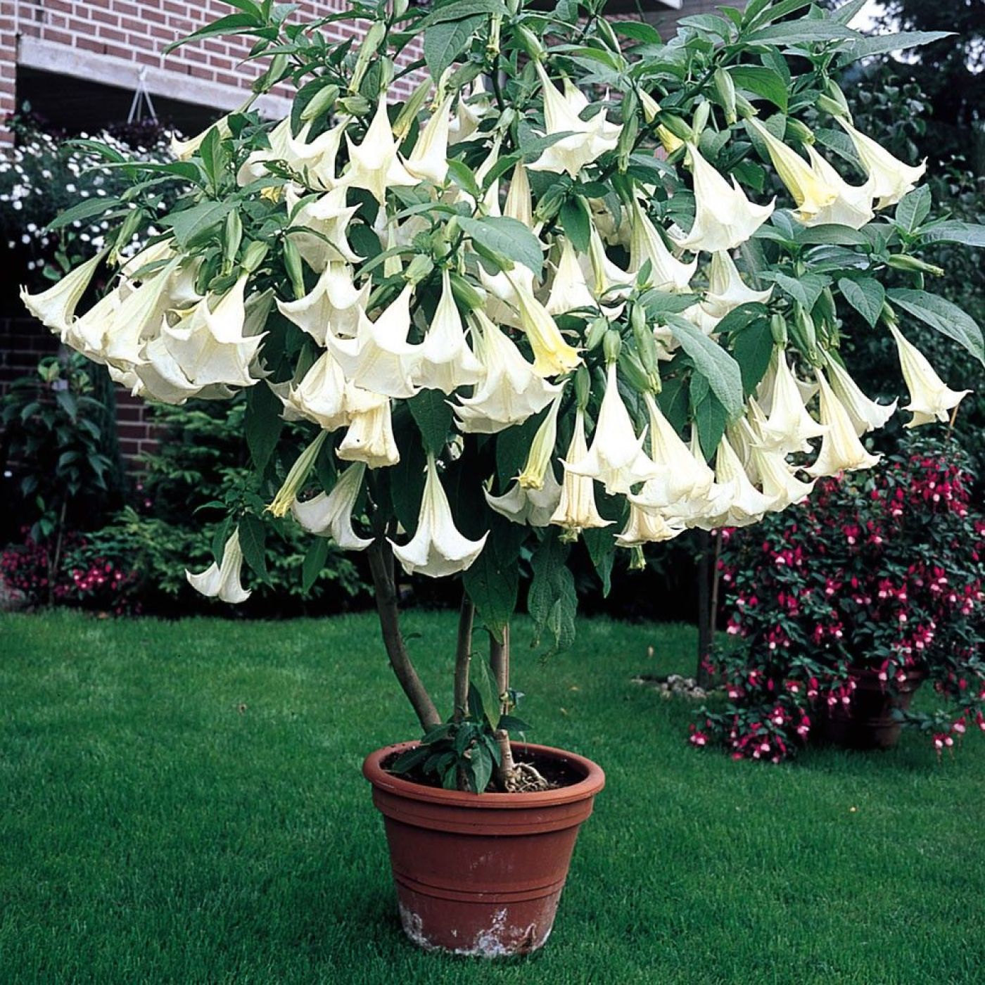 Бругмансия – цветок необыкновенной красоты. Яркая представительница семейства Пасленовые популярна среди ценителей тропических растений. Секрет успеха объясняется внушительными размерами жилистых листьев и граммофонами, источающими пьянящий аромат. Яйцевидные листья достигают в длину 30 см, поникшие колокольчики – 50 см. Окраска бутонов варьируется от девственно белой до кроваво красной, что позволяет сочетать разные сорта и получать сказочные по красоте флористические композиции.